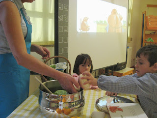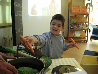 No decurso da atividade as crianças forma convidadas a participar e a colocarem os ingredientes referidos no livro, na panela!Uma forma didática de elas aprenderem o nome dos legumes/leguminosas e a sentirem a sua textura!