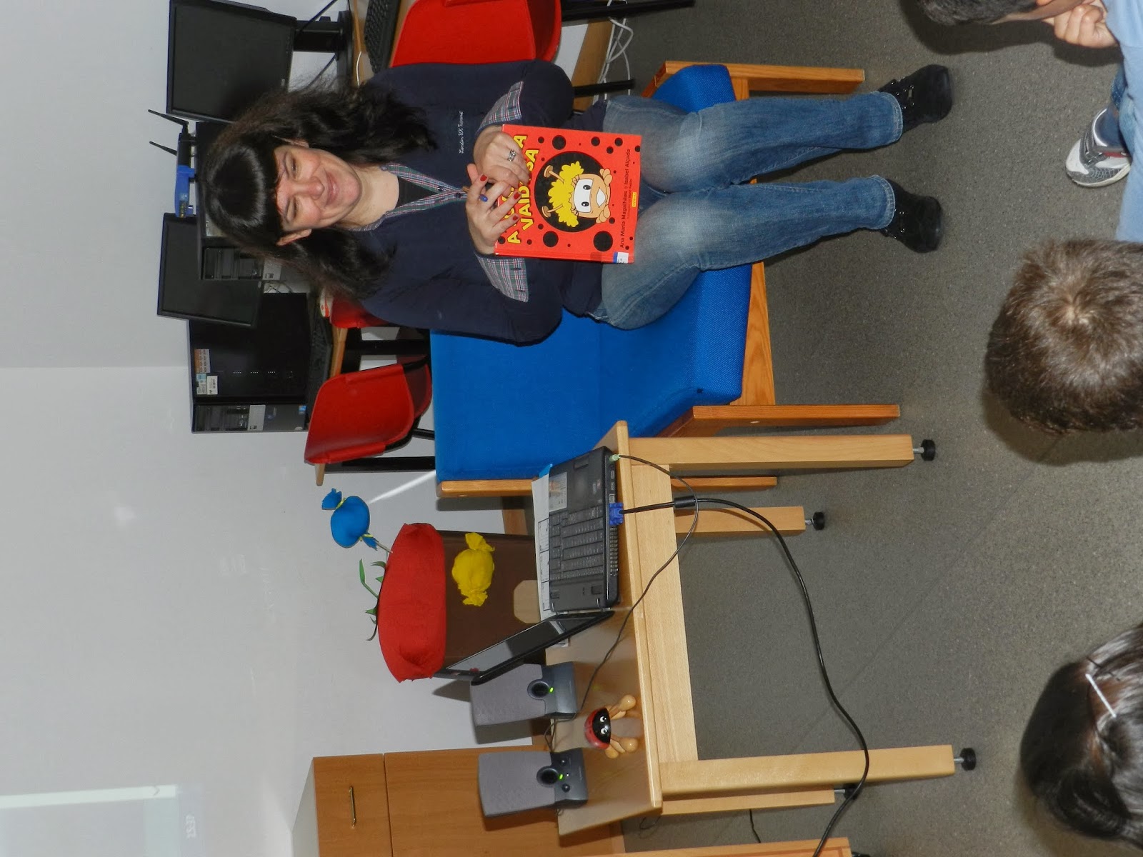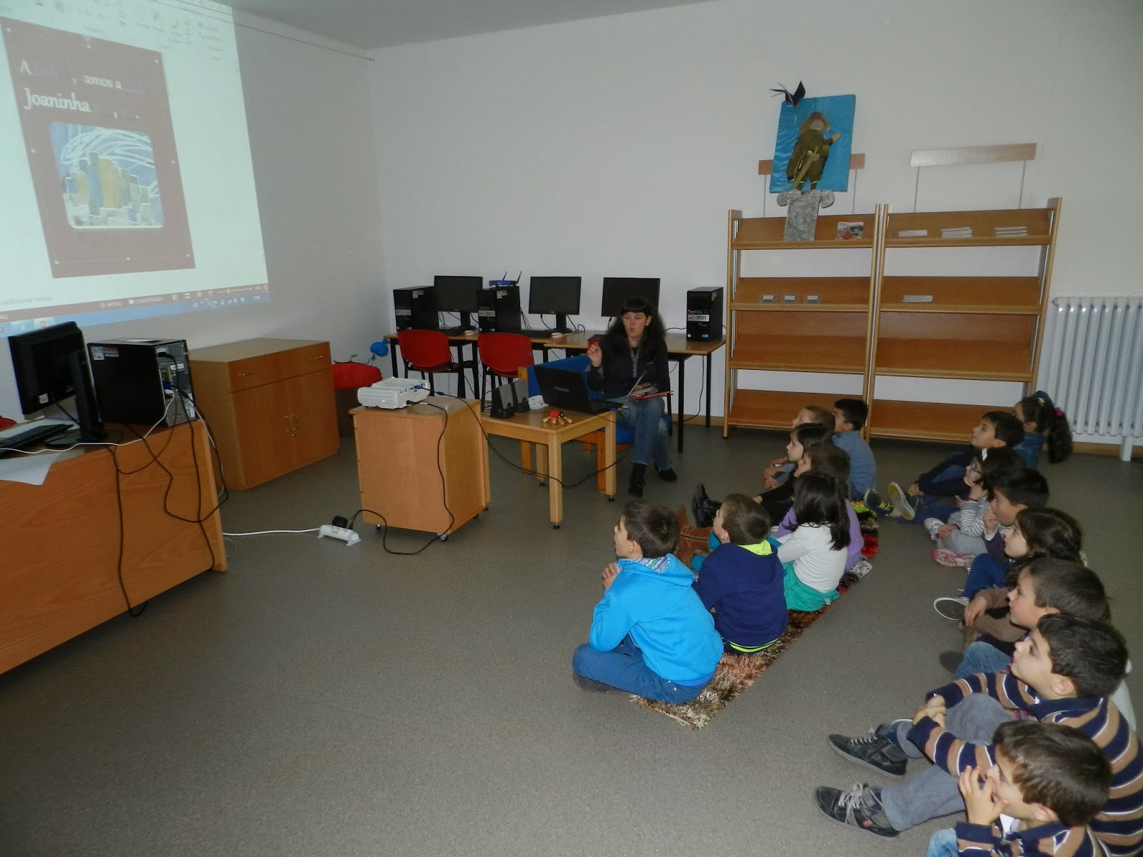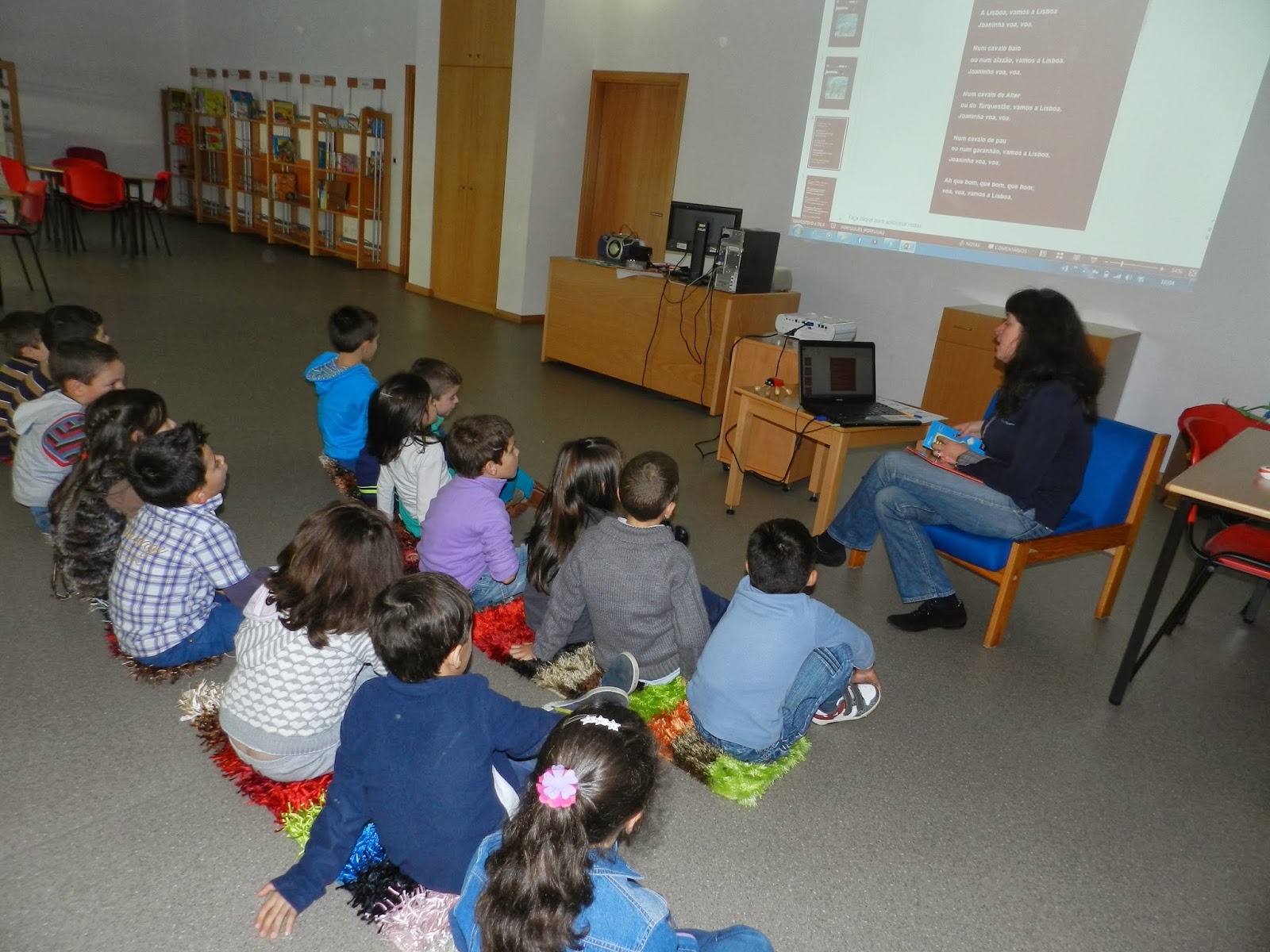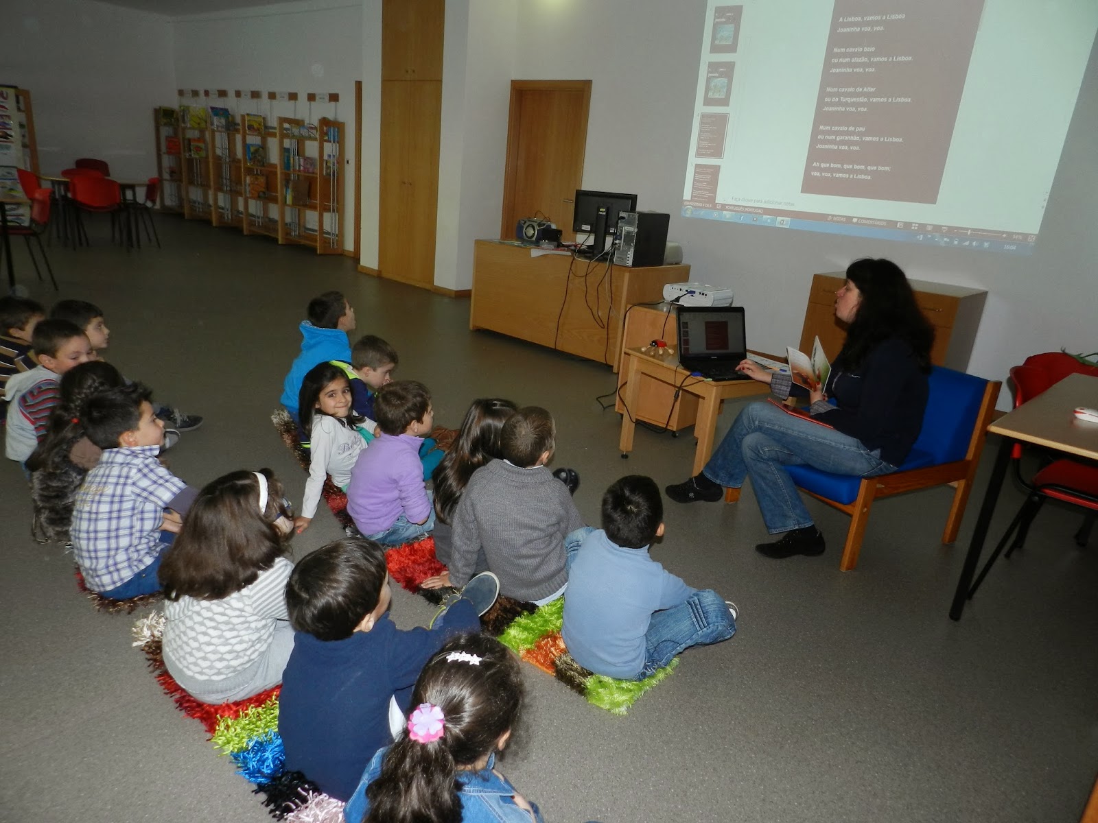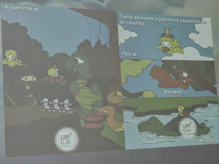 Ouviram inicialmente o conto A Joaninha Vaidosa de Ana Maria Magalhães e Isabel Alçada através do Ler +Giro da Biblioteca de Livros Digitais e depois passaram à análise do poema.